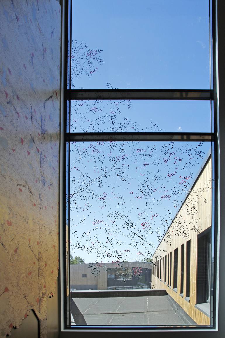 Commission at Hoppern school and sports arena Jeløya, Norway for Moss municipality, 2019 Pyrography, gold paint, red ink UV-print on film