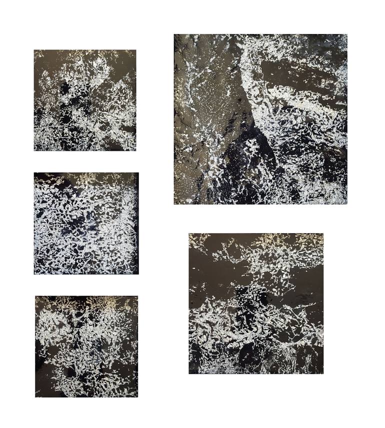 Five individually framed artworks made with aluminium foil, acrylic paint and resin on synthetic board. The idea of this project was to show the hidden beauty of every day materials such as aluminium foil and turn it into Art. The 5 pieces come framed (see photos) and are ready to hang.The dimension...