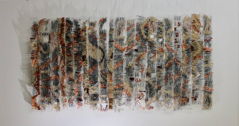 The work represents the merging of abstract concepts created in the process of thinking about modern man. Dynamic interaction of different approaches to monumental painting and contemporary textile joins two modules in one work. The impression of a massive and synchronized breath in the installation...