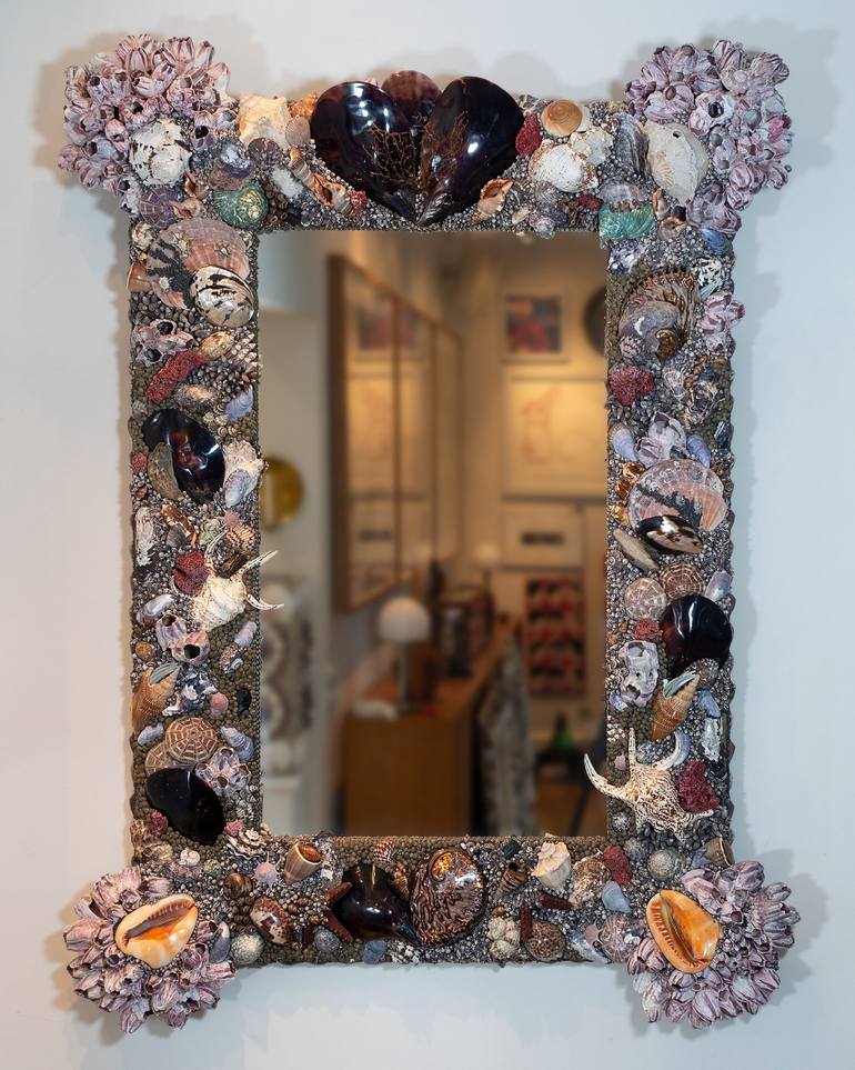 We sometimes refer to this big mirror as our big, fat, rich, dark, powerful, bombastic, over-the-top, make-a-statement, baroque conversation piece. Still elegant and very expressive – it will pop out of any wall. Who dares? Polished flag pen shells, barnacles, orange helmet shells, chiragra spider ...