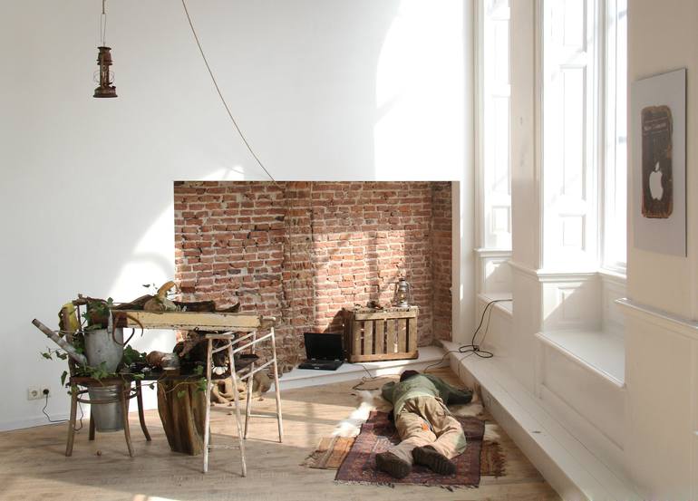 This installation was made for my exhibition in the Oude Apotheek in Zutphen, Nederlands. IT consists on a dripping structure with plants and snails, a lying man on an animal fur and carpets a lap top computer an oil lamp and some tools. It represents the quest of humanity after being condemned to l...