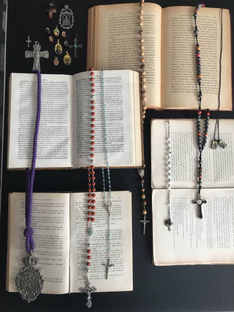Instalación con libros, rosarios y exvotos