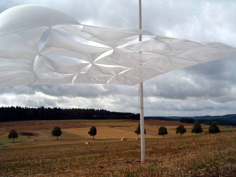 Description: This "flying carpet", how the title describes, was a contribution for the art competition "Bewegter Wind"(moved wind) at the Edersee(lake Eder)region in Germany and finally got the first prize. Medium: silk fabricYear Created: 2004 Price: 2500.- €