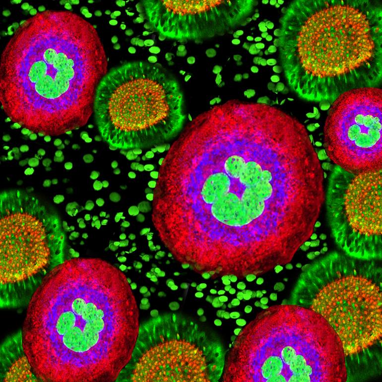 A combination of various parts of paintings and photos and then printed with the finest pigment colors on acrylic glass. Print run 6, signed on the back, limited edition. Elements of the universe are looking in their combination like flowers and leaves. Brilliant red and green colors on black.