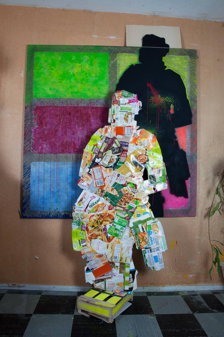 This work may be green (vert) because it consists of salvage items, cardboard boxes and newsprint. It also takes the silhouette of KropoTotemkin, both in painting and sculpture. Finally it's a kind of 3D portrait of a great character, a kind of totem, and a play on words with "le grand verre" of Mar...