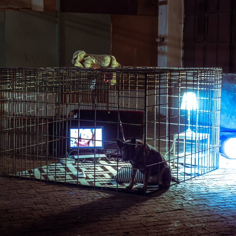 We live a beautiful life. Full of food, porn and IKEA furniture. Gold plated cage (1300 welds), living dog or plushy dog, fictive 'DogasmTV' broadcasting: fuck & food (only animal dog porn + TV commercials for dog food), Ikea Stockholm equipment, Xbox etc.