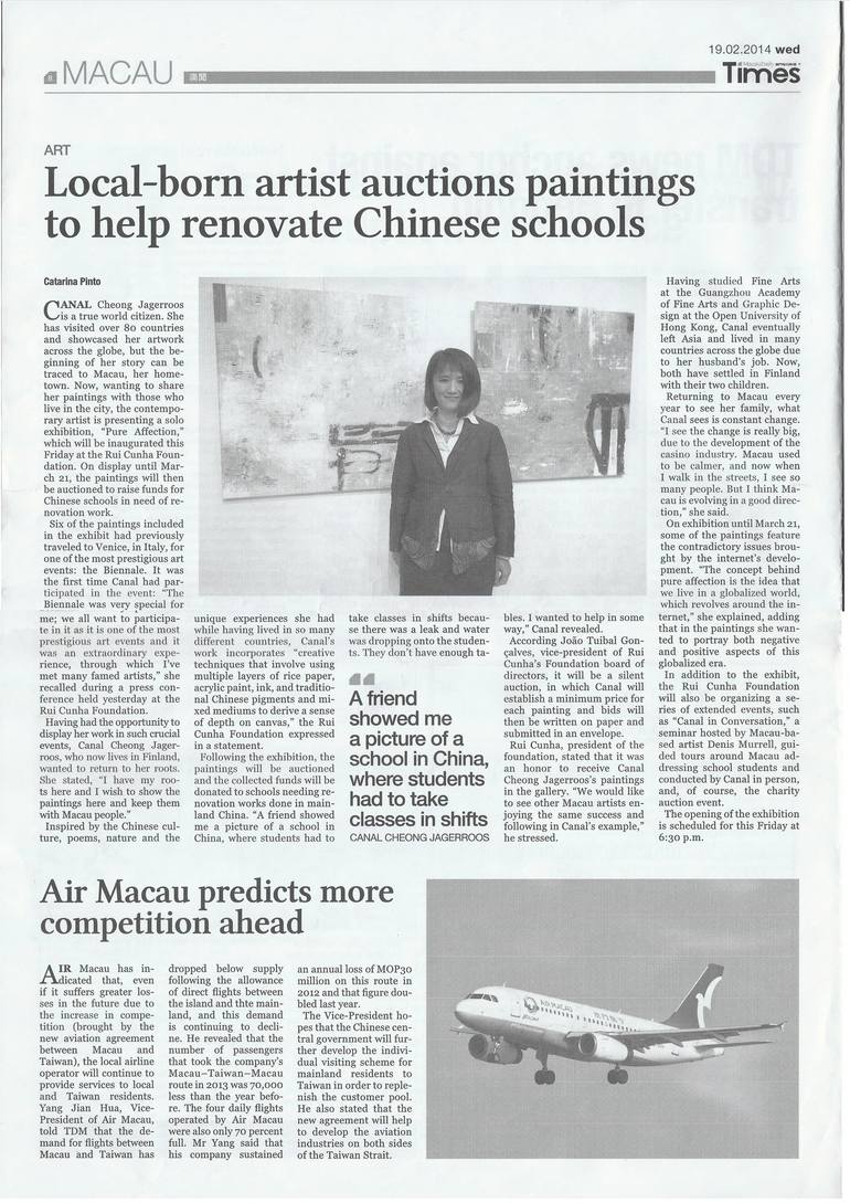 Macau Times Newspaper review of my solo exhibition 'Pure Affection' at Rui Cunha Foundation, Macau, China