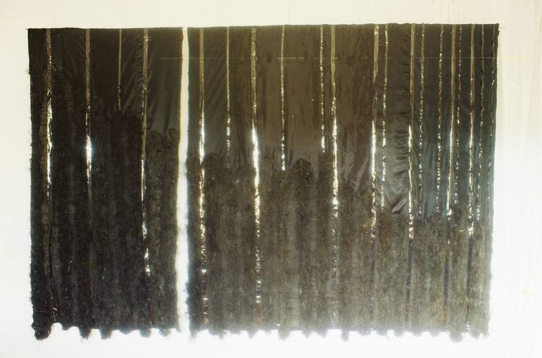 Bad photograph..unfortunately Diptich.This work consists of two parts,each suspended from a metal rod,105cm and 205 cm long.On a bacground of dark grey cloth loose fibres are attached in stripes,the top line descends diagonaly, tracing the verticals made by strips of shiny black foil