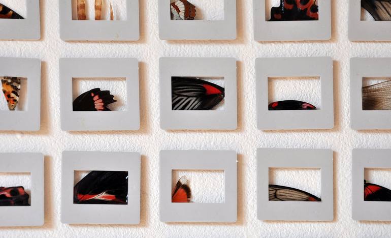 Red DIA, vitrified insect wings on slide frames, unsettled dimensions, 5x5 cm per element, 144 elements, 2011, detail These insect wings on slide frames associate in a fragile membrane the camera click to the wing beat and explore our tendency to fix life and time instead of appreciate them.