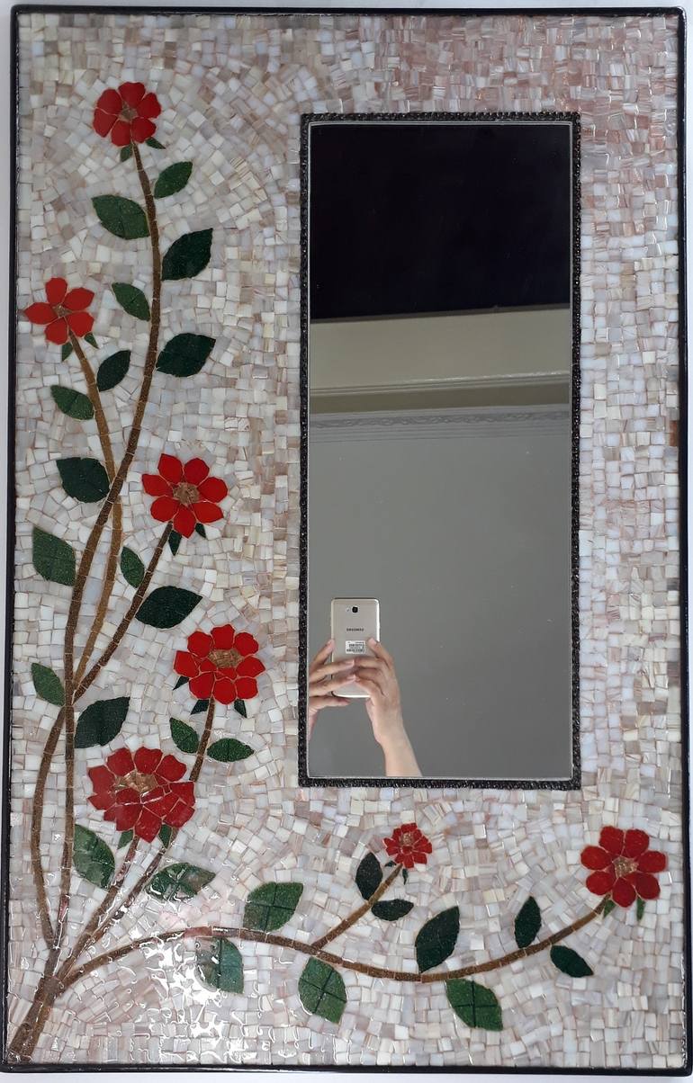 LOVELY Handmade Mosaic art with mirrors, decorated with lovely rose flowers made of hand-cut glass mosaic tiles and beads, and coated with a layer of resin on the surface. It is an original piece of value and attractiveness, a distinctive piece that fits the modern and classic styles both designed...
