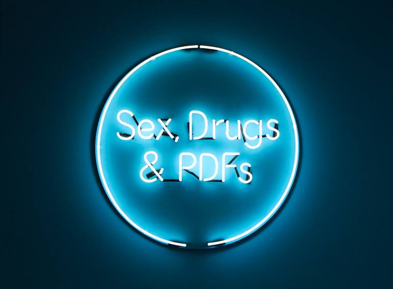 1.1m x 1.1m white neon on a blue backboard, featuring a bespoke typeface design
