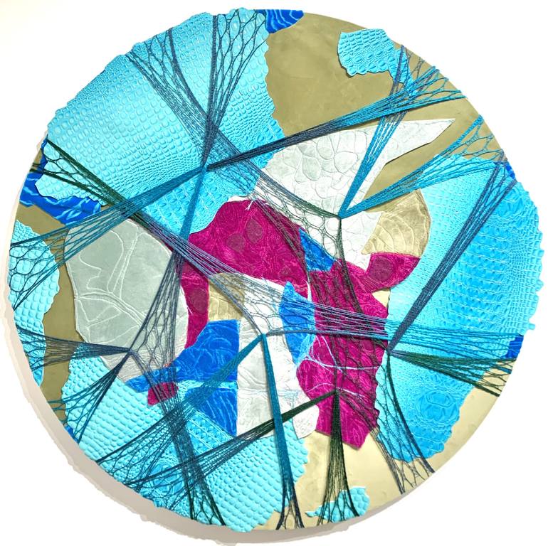 This brightly colored, mixed media, fabric/fiber collage is on a canvas covered, circular, stretcher frame. Different types of vinyl and velvet are layered, and intricate stitching with thread holds it all together. Yarn lace has been stretched at varying points across the canvas to evoke a nature-i...