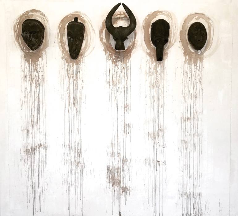 This compelling installation, "TETES BRULEES, 2016," features burnt masks on paper, carefully mounted on wood. The artist's unique technique brings a raw, evocative quality to the figurative forms, rendered in stark noir and blanc tones. The textures of the burnt paper against the solid wood create ...