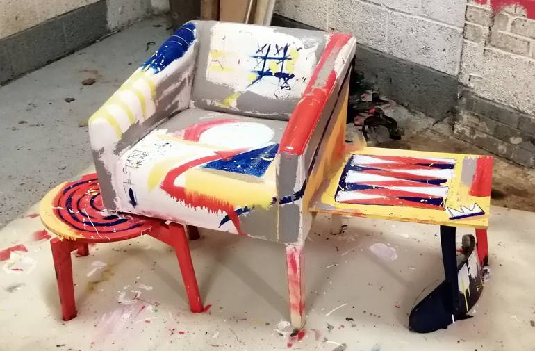 A raw piece with more of a graffiti type feel to it. It's 2 chairs merged together. Weirdly enough I took my inspiration from a back gammon board and the pointed elongated shapes. I normally have found the furniture and the idea grow from there.