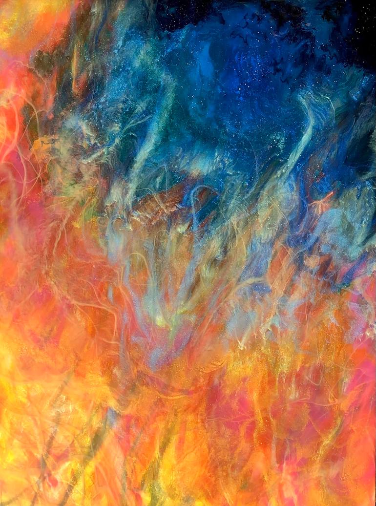 Tiffani created the YTERA NEBULA in a fluorescent array of colors launching forth with unimaginable vigor against the stark blackness of space. Small twinkles of far-away stars peek through the translucent luminosity of the burgeoning nebulaic clouds. The nebulae coming out the James Webb infrared t...