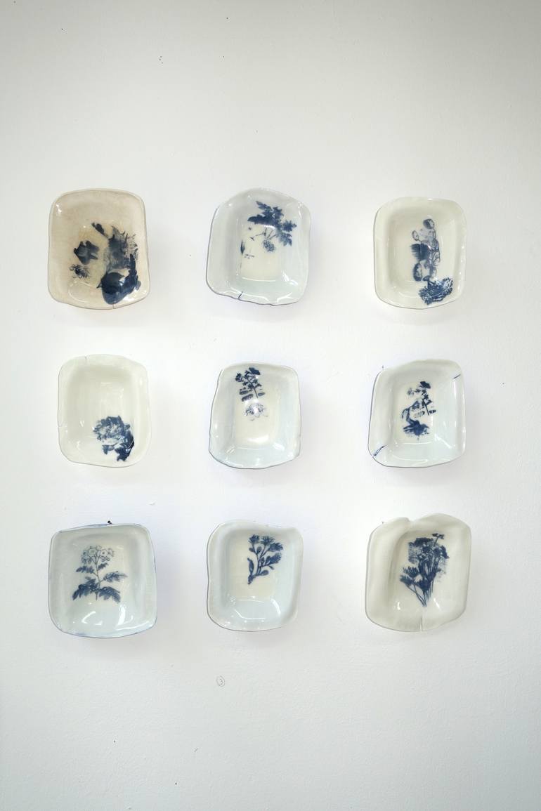 Poetic porcelain wall object, containing 9 bowls with silkscreened delft blue prints of botanic drawings