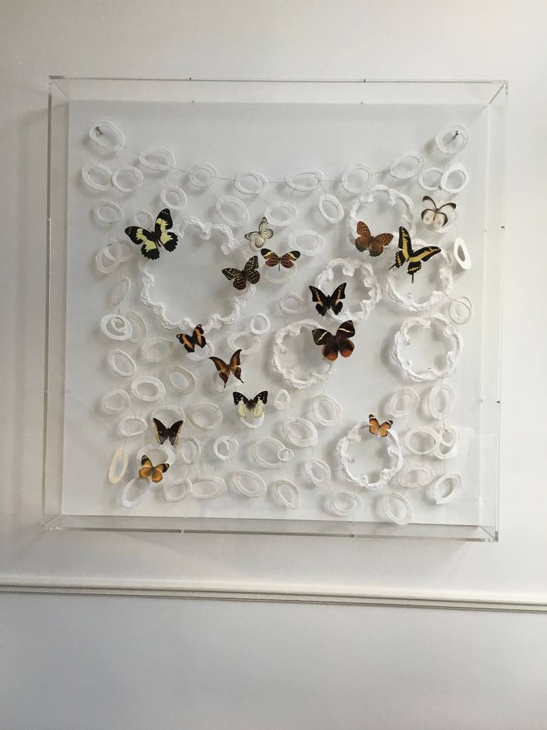 this is a porcelain woven wall carpet. The butterflies just sat down on the carpet. It is hanged in a plexi glaze box every piece is uniek.