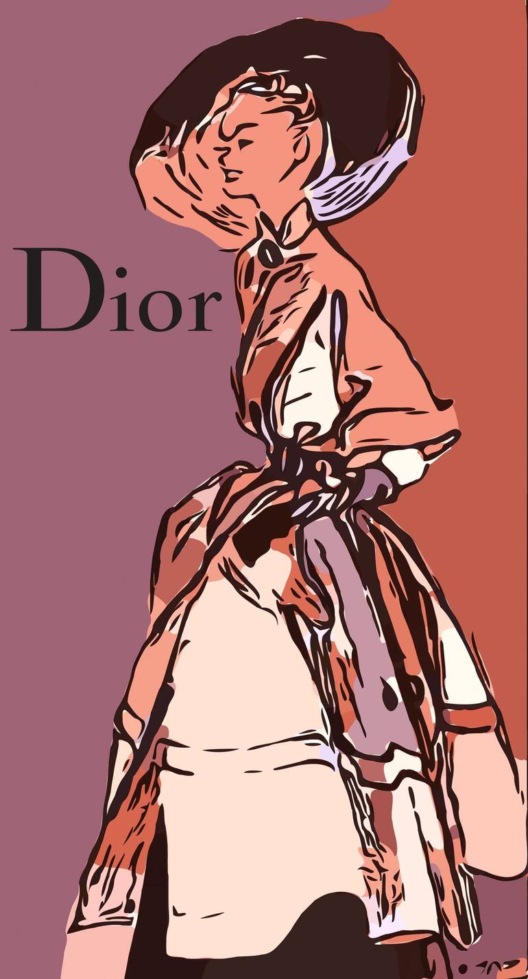 A contemporary digital pop art portrait based on a vintage fashion illustration of a sophisticated model sporting a wide-brimmed hat, elbow length gloves, and a very chic Christian Dior coat with a full skirt and tightly cinched waist. I used muted shades of dusty plum purple, terra-cotta, coral, be...