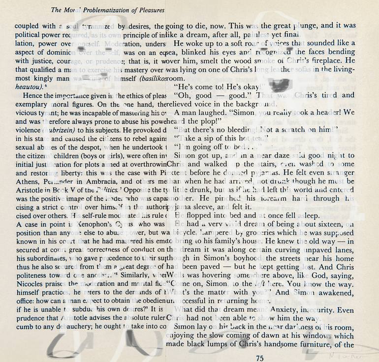 8175 - Page 81 of "The Use of Pleasure Volume II" by Michel Foucault and page 75 of "Mermaids on the Golf Course" from the short story, "Chris's Last Party" by Patricia Highsmith - book pages on paper photographed and digitally manipulated.