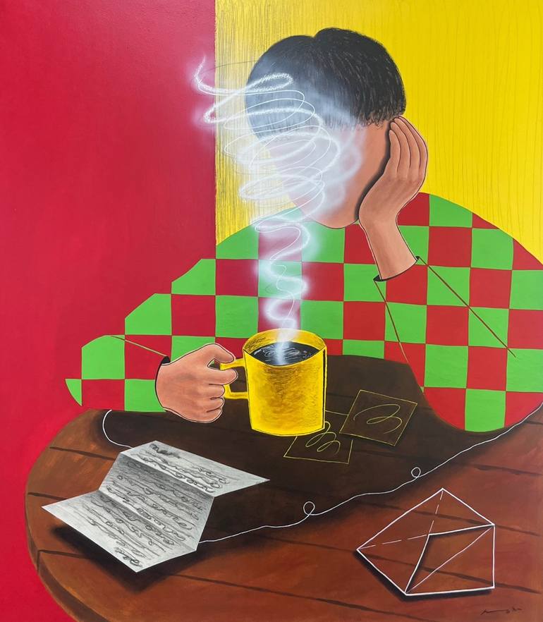 A Letter Unfold portrays a man seated in quiet contemplation, holding a single letter as steam curls upward from his coffee. His face, softened by the vapor, suggests a moment suspended between words and thought. Against a vivid red-and-yellow backdrop, structured patterns meet free, flowing marks, ...
