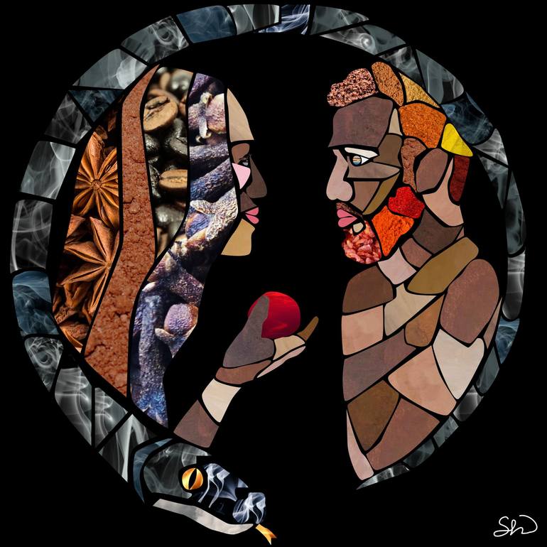 "Adam and Eve" is inspired by the Bible story when Eve offers Adam the forbidden fruit. I use paint swatches that I made and photographs to create digital collages. I used spice for the hair, because that's what I think is a good description of hair-- it's our spice to our appearance. My human figur...