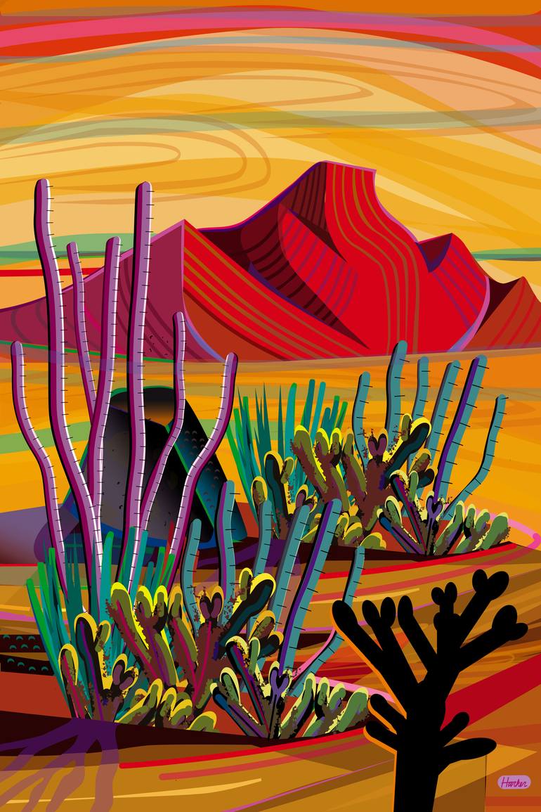 Stylized contemporary desert landscape in vivid sunset colors; orange, rust, red, yellow and amber. Inspired by the Sonora and Mojave deserts of Northern Mexico, Arizona, Southern California and Nevada.