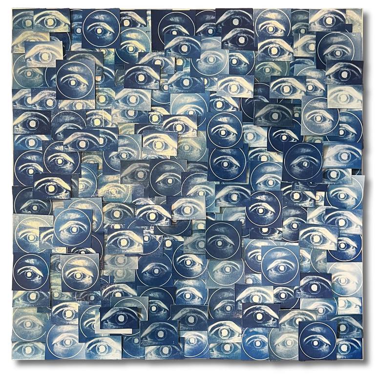 My canvas collage works are a fusion of abstract expressionism and human psychology/exploration. In this work, I applied multiple layers of printed cyanotypes developed at multiple exposure times (which makes them darker or lighter in saturation). I attached them permanently to the canvas using var...