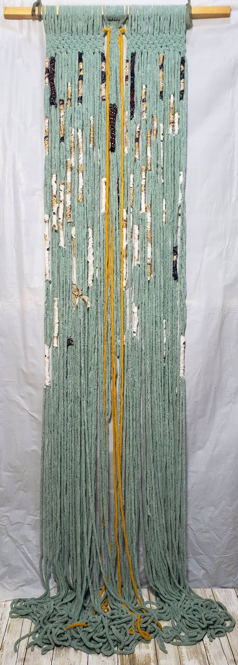 The artwork is a hanging textile piece featuring long, vertically aligned strands of light blue-green chenile yarn. The strands are suspended from a horizontal wooden rod. Interwoven within the yarn are sporadic segments of various colors, including white, black, and shades of brown, creating a vari...