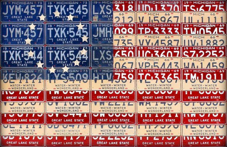 Betsy Ross' iconic version of the American flag is brought to life using vintage recycled license plates repurposed to form an eclectic vision of the stars and stripes. * Please note that for any original purchase, a new version of this piece will be created and will differ somewhat in regards to p...