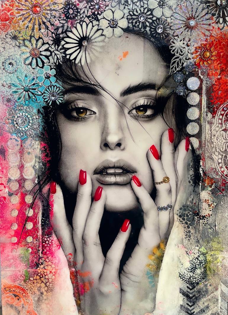 My name is Tarja Vandergoot (Art by Tar) and I’m a self-taught artist from The Netherlands. I specialize in realistic portraits of women and mixed media art.My creative process is driven by intuition and a deep connection to womanhood, strength, vulnerability, and mysticism. It’s often after I've finished an artwork I understand what I've wanted to express. I start with a detailed graphite pencil drawing of a woman with a specific 'look' in her eyes or a captivating composition, which reflects my primary focus on drawing. While drawing is central to my work, I occasionally incorporate other media like photography or print. From there, I bring the artwork to life by adding vibrant paints, diverse materials, and intricate details. Once the physical piece reaches a certain point, I take a high-resolution photograph and bring it into the digital realm, where I experiment with colors, shades, and composition to enhance what the artwork needs. Depending on the final vision, I have the piece printed either behind plexiglass, which gives it a modern, polished look, or on aluminum dibond. If printed on aluminum, I continue the creative process by adding more paint and materials directly onto the print, further refining the piece. I then finalize the work with one or multiple layers of resin, creating a layered effect that adds depth and makes the artwork truly stand out.