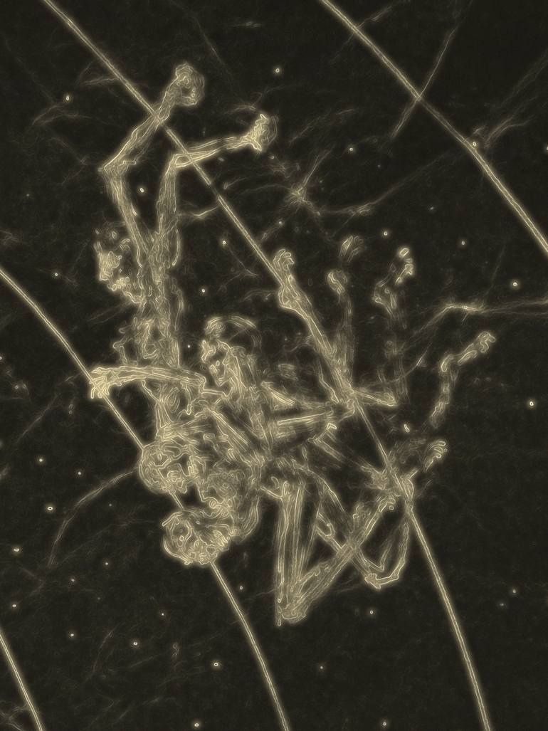 This recent series of digitally manipulated photographs of drawings entitled "Spiritgraphs" are part of an ongoing exploration of the primal human condition expressed by human figures floating and tumbling across a grid of time and space. There is a nebulous sense of scale as the figures might be ti...