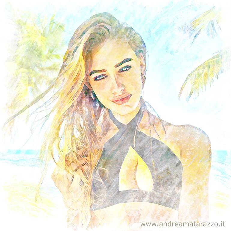 Portrait of the Beautiful and Charming Anna, with the beach and sea in the background. The poetry of the painting effect, watercolor, oil on canvas, created with computer graphics, emphasizes the beauty of the model.Inspiration from P. Gauguin's girls Digital painting, impressionist style.