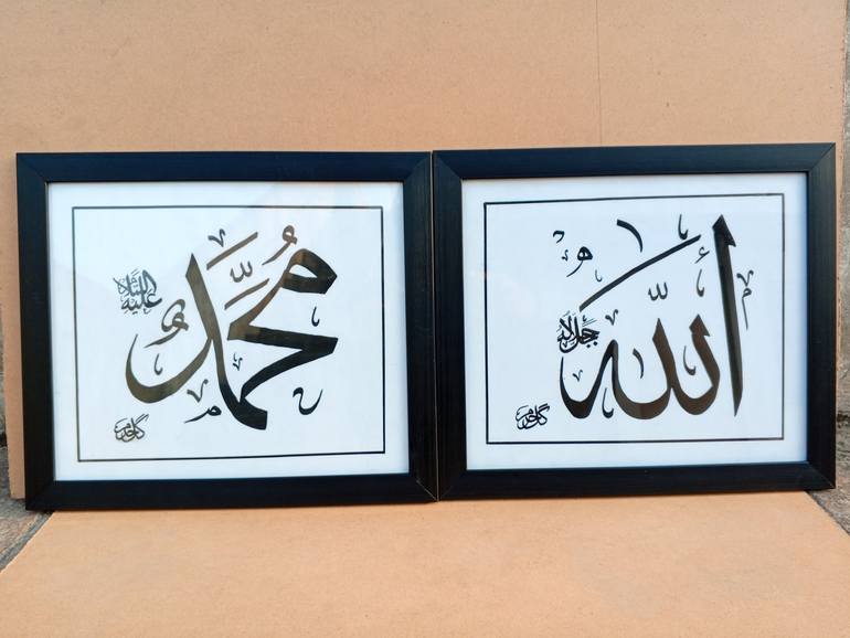 Explore the graceful curves and lines of Arabic calligraphy—a true reflection of art. Allah سُبْحَٰنَهُۥ وَتَعَٰلَىٰ is The Most Glorious, Honorable, Dignified and generous. Muhammad (SAW) Peace be upon Him the beloved Messenger of Allah Two frames showcase exquisite calligraphy artworks of 'Allah...