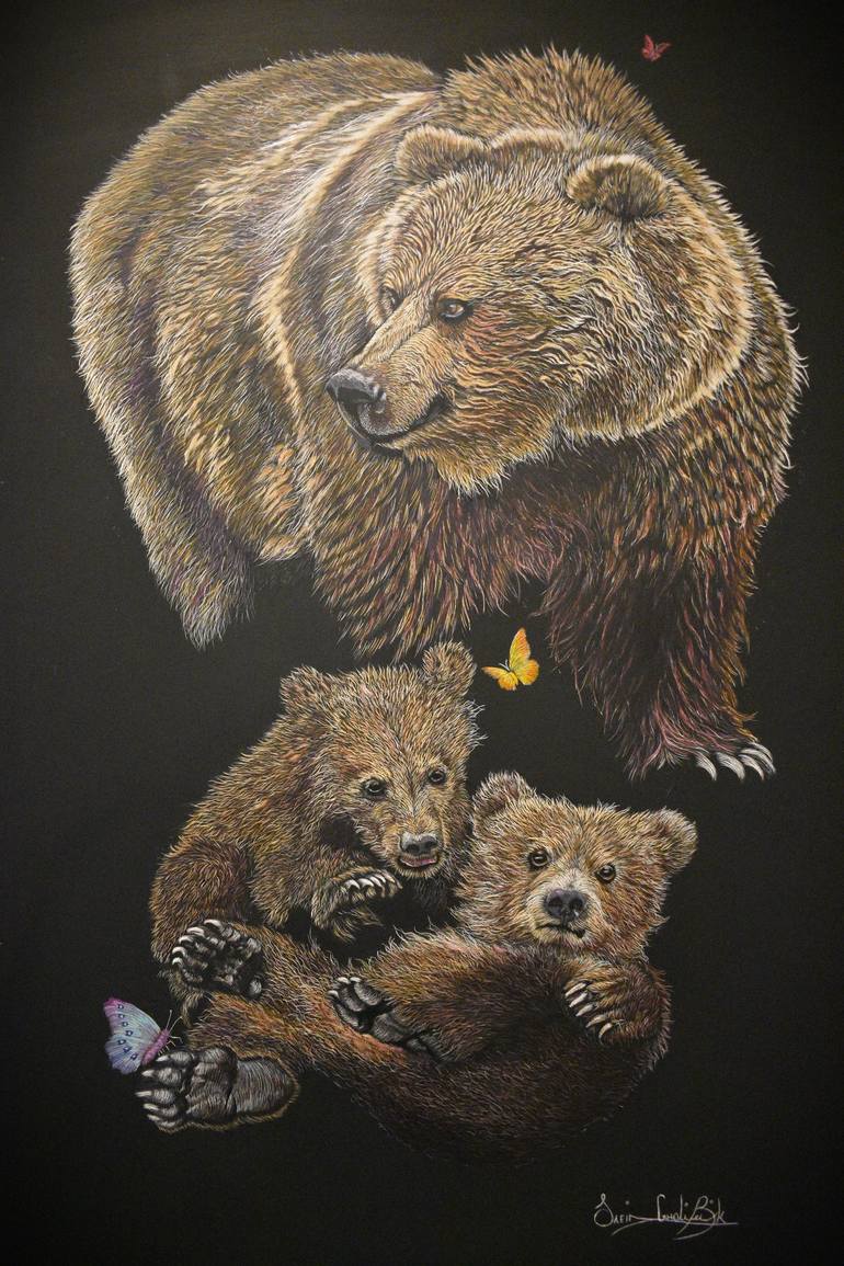 The inspiration for my scratch art paintings comes from love for animals and how they carry that love over the years! I believe this is such an important way for the new generations to help and preserve our wildlife. The main character in this scratch art painting is a brown bear mom and her two cub...