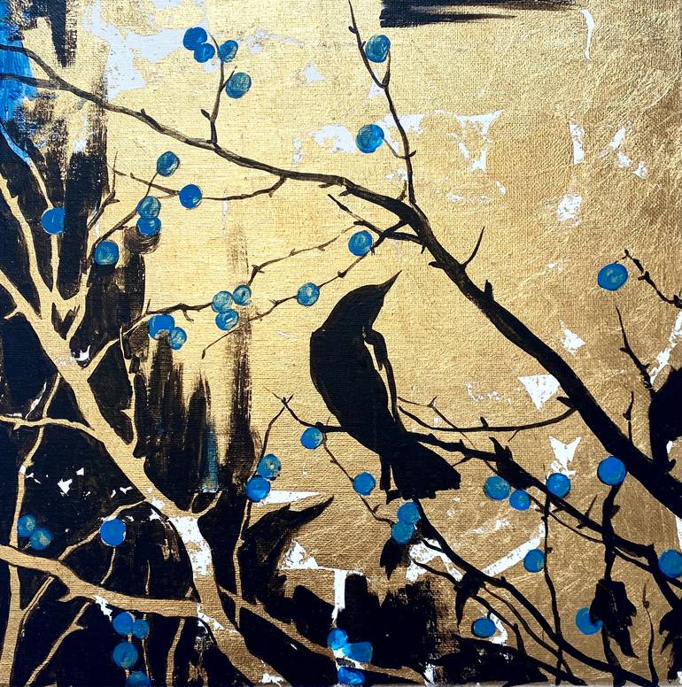 Stretched Canvas 12x12in, used natural gold leaf, silhouette drawing depicts a bird on the branches of a tree. I tried lacanically and expressively to convey that transitional state of nature. Flying also implies emotional freedom. The whole world is open to birds. They are endowed with a gift that ...