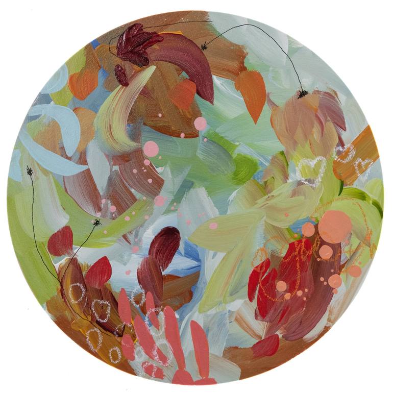 A colourful round nature inspired abstract. Perfect for a small space. Acrylic on wood craddle. 31 cm diameter x 2 cm thick (12 inch diameter x 1 inch thick) Varnished to protect against U.V. Sides: beige. Ready to hang. Signed on the back. Shipped in a cardboard box with a certificate of authenti...
