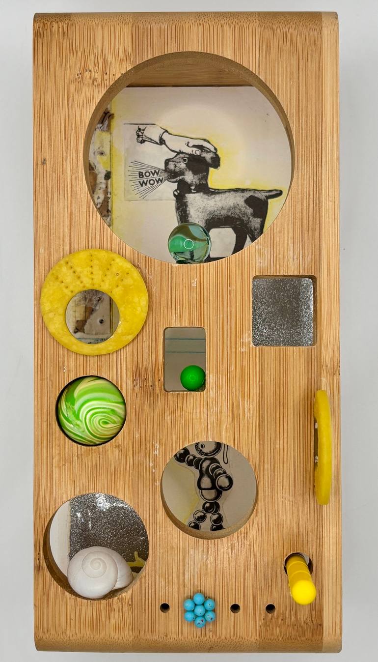 Bow Wow is a shadow box assemblage of vintage toy illustrations and found objects. This artwork combines colors and shapes in a geometrically intriguing and playful display. It is the product of my love of children's toys from the early 1900's through the early plastic ones of the 1980's.