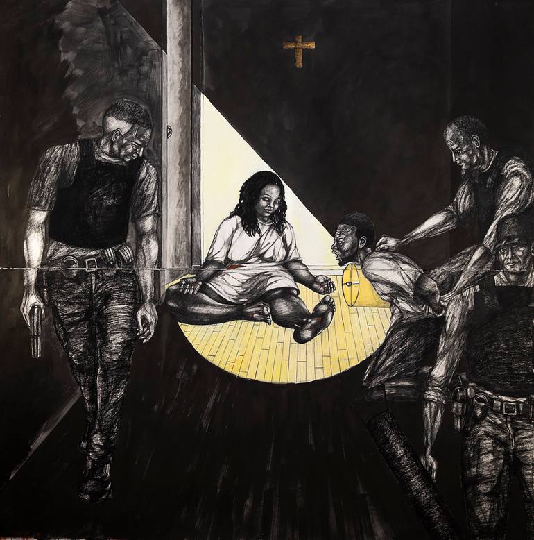 A haunting portrayal of Breonna Taylor, the 26 year old EMT who was killed by Louisville police in her own home on March 13, 2020. Breonna sits cross-legged on the floor, wearing a white nightgown, her expression calm and open. Her hands and feet bear the red marks of stigmata, a quiet gesture. A...