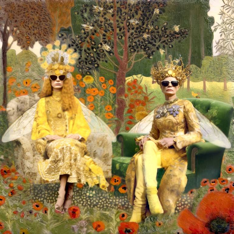 "Brigitte & Margot, Queens of the Colonies at Sunset Boulevard" My work combines contemporary digital collage with traditional, tactile media to create layered encaustic paintings. Each piece begins with a visual daydream—something beautiful, absurd, or quietly political—and is built from digit...