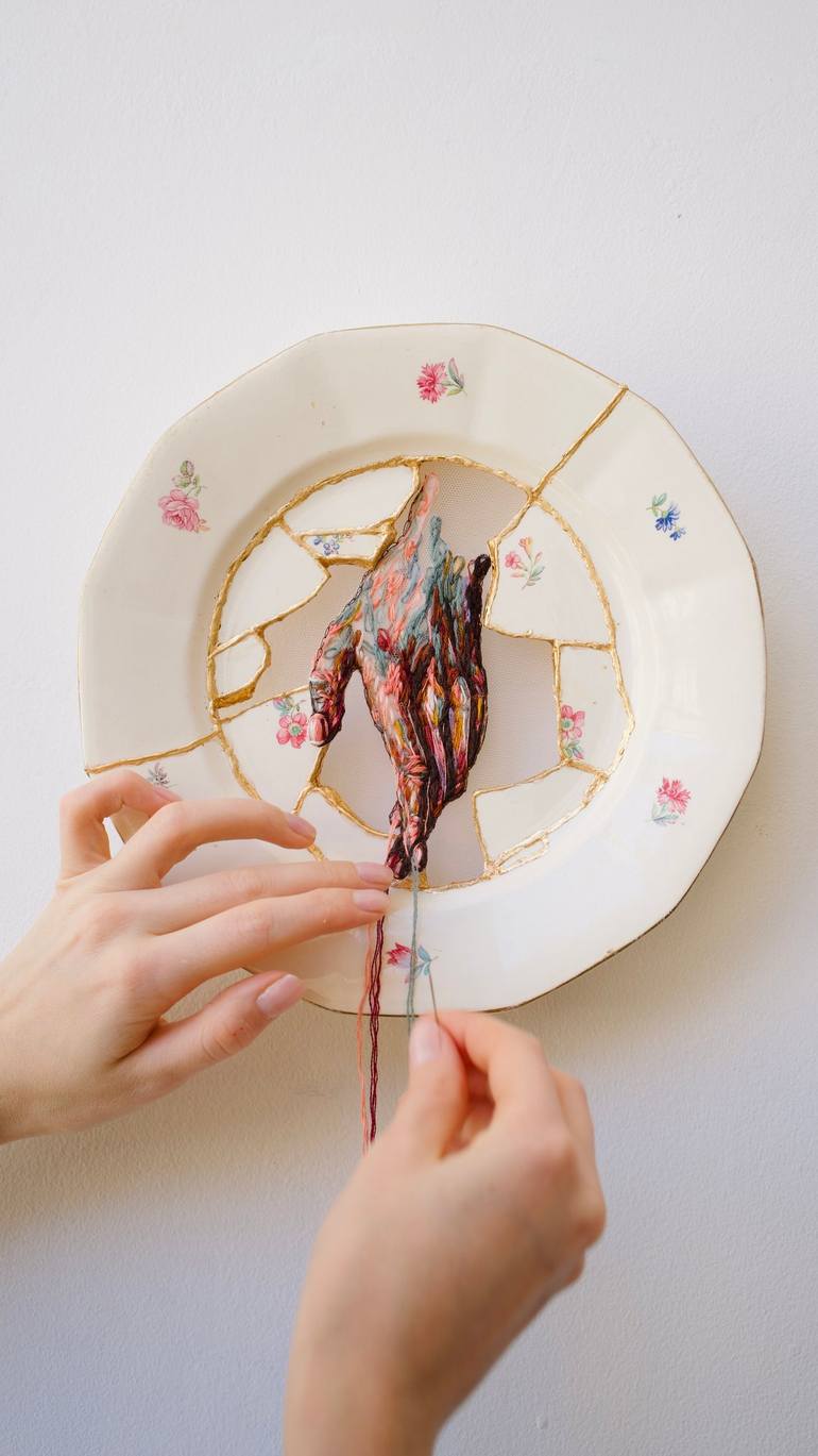 This artwork is a fusion of traditional and contemporary techniques, combining the ancient Japanese art of Kintsugi with modern embroidery. The piece was created in collaboration with embroidery artist Kathrin Marchenko. Inspired by the beauty of imperfection, it highlights the philosophy of wabi-sa...