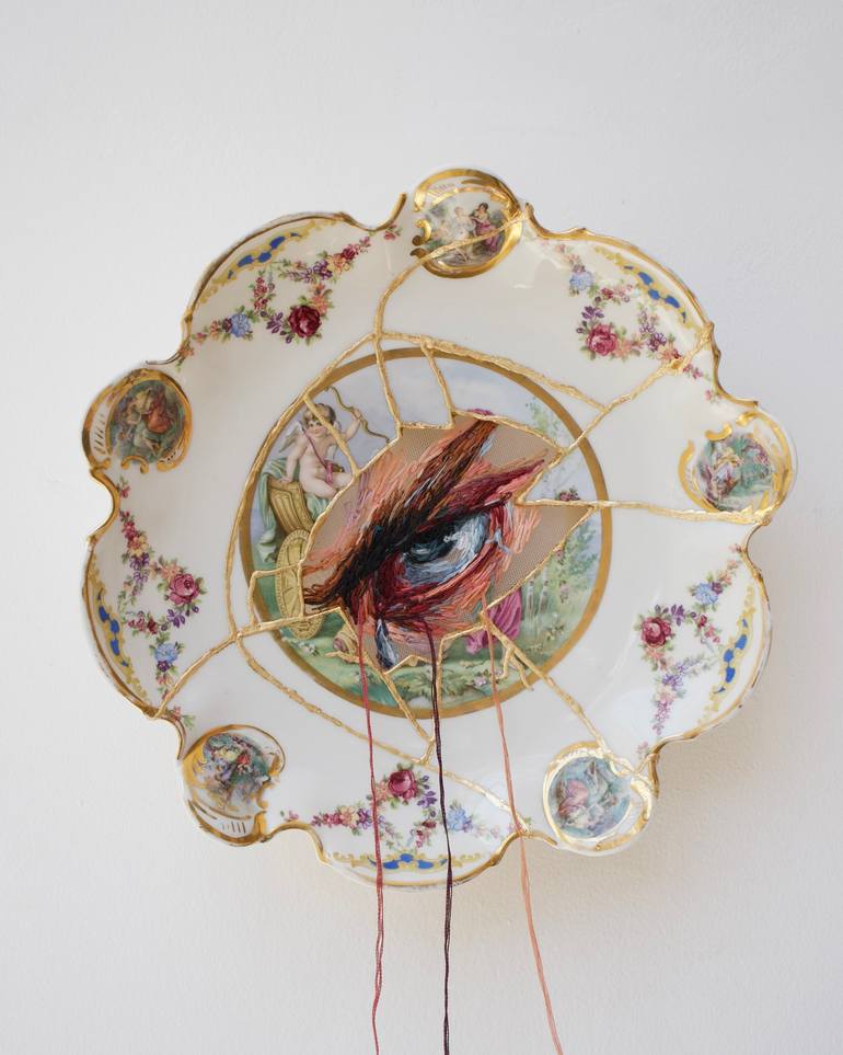 This artwork combines traditional porcelain restoration techniques with modern embroidery, featuring a detailed eye stitched onto a broken, vintage plate. The work was created in collaboration with embroidery artist Kathrin Marchenko. Inspired by the philosophy of Kintsugi, the broken plate is mende...