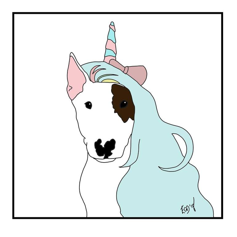 Bull terriers are as rare to see in the street as unicorns so I was inspired to represent this conceptual idea in a work of modern whimsy. The nature of the breed is a paradox... A sweet face with a fierce reputation. The canvas is as modern as the vector drawing and the shine and durability of st...