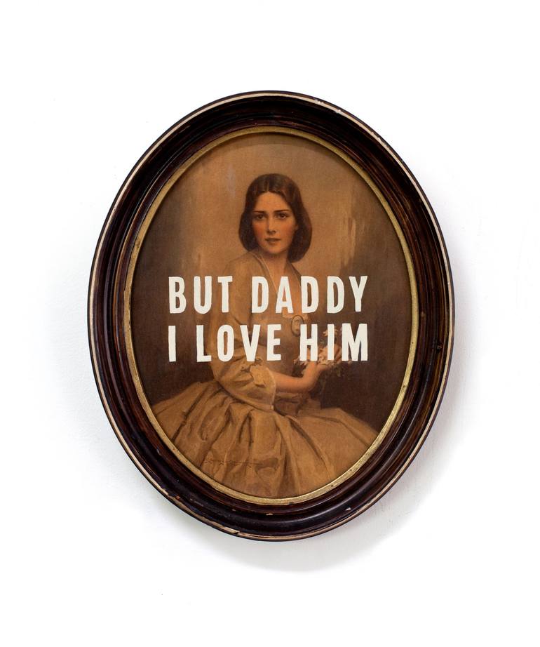 But Daddy I Love Him is a thought-provoking mixed media artwork that juxtaposes a classical, vintage portrait of a young woman in 19th-century attire with bold, modern text overlay. The phrase “BUT DADDY I LOVE HIM” is painted in stark white block letters across the image, creating a powerful visual...