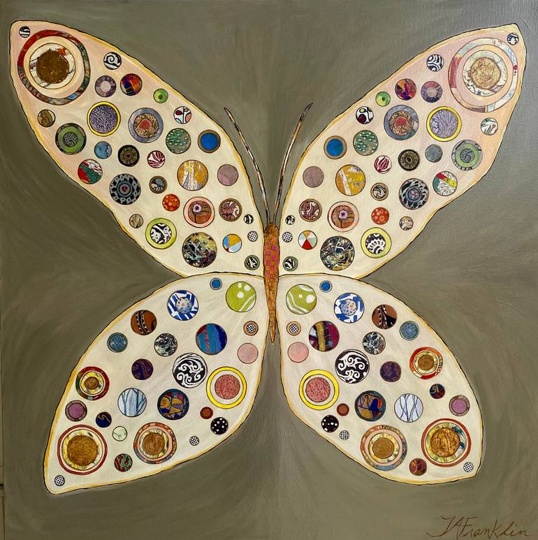 This original mixed media artwork features a playful butterfly created with layers of colorful paper, patterns, and shapes. Touches of gold leaf add a shimmer of luxury to the piece. The artist's joy in nature and its beautiful creatures is evident in every detail. The artwork combines acrylic pain...
