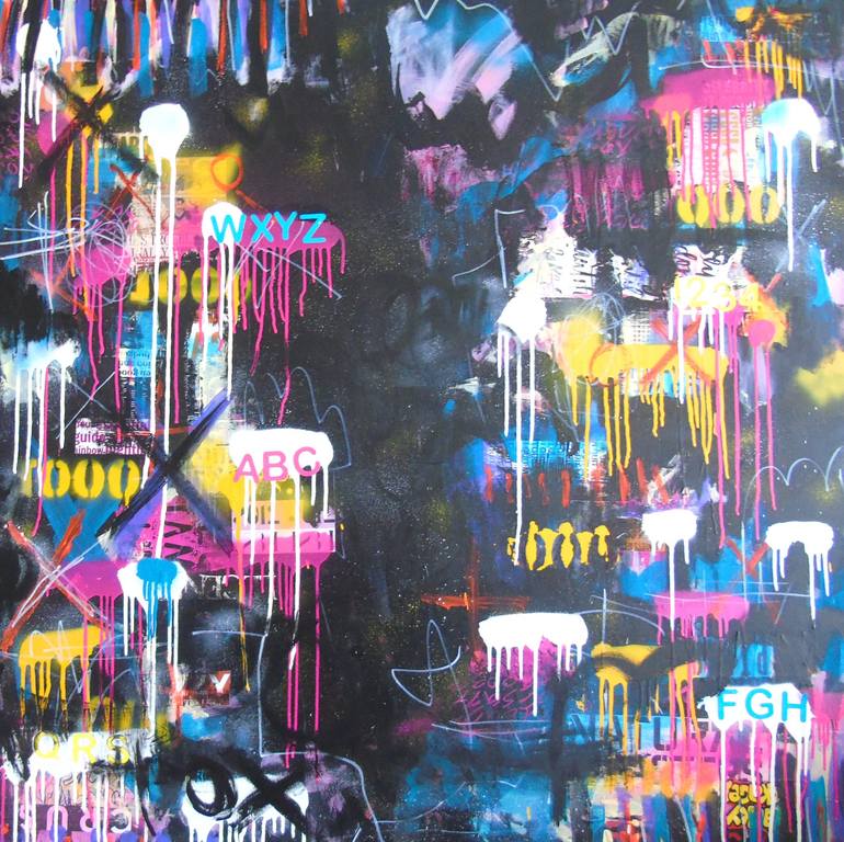 Layers of text snippets, numerals and letters, asemic writing, graffiti, spray paint drips and more on black background, reminiscent of peeling billboards, neon street signs, reflections in the rain. A statement piece. Wire on back with edges painted black, ready to hang.