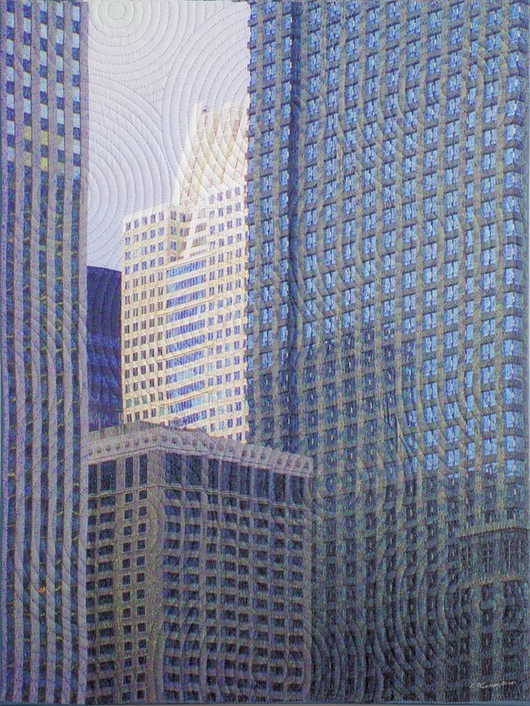 digitally manipulated photography, pigment printing on silk, hand quilting, gallery-wrapped on stretched canvas support