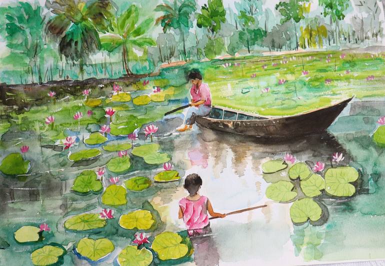 This painting vividly captures a serene and idyllic scene in Bangladesh, showcasing the harmonious coexistence of nature and human life. In the foreground, two children are immersed in the shallow waters of a lily-covered pond. One child, standing knee-deep in the water, gently guides their way with...