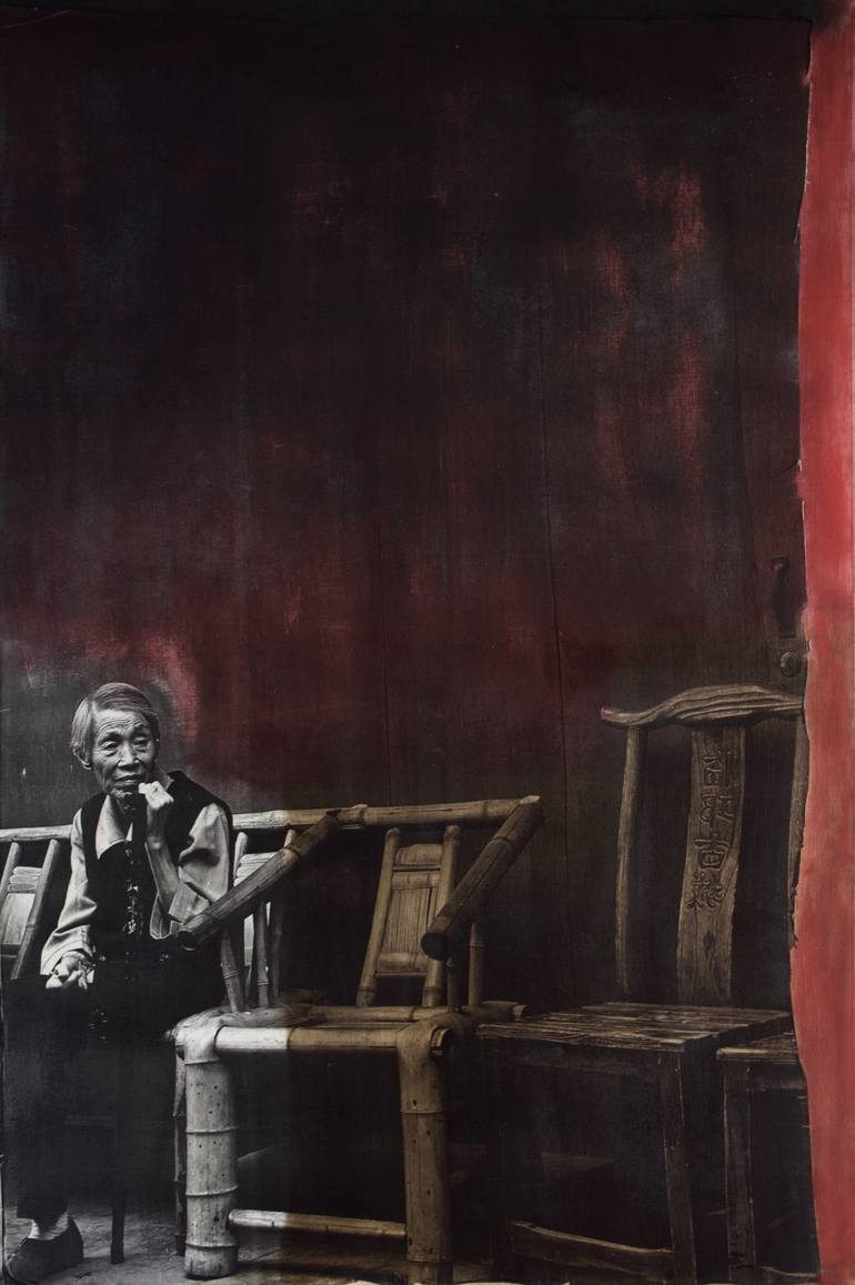 A pensive old Chinese lady...at the bend of a temple...sitting...lost in thought...sad?...worried?...worried?... Ink. Oil. But not more. The photo is strong enough to only add the colors of the moment. Red for China, umber for the decor and gray for the stone. Only authentic. TECHNIQUE: the artist t...