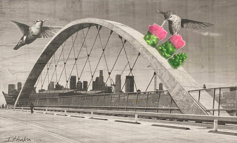 "Colibrís Gigantes en el Puente de la Calle Sexta" is a 2024 mixed-media artwork by photographer/artist Ithaka Darin Pappas for his international photo-collage series, Urban Nektar. Created on wood with ink, paper and acrylic paints, the original piece measures 120cm x 80cm. "Colibrís Gigantes en e...