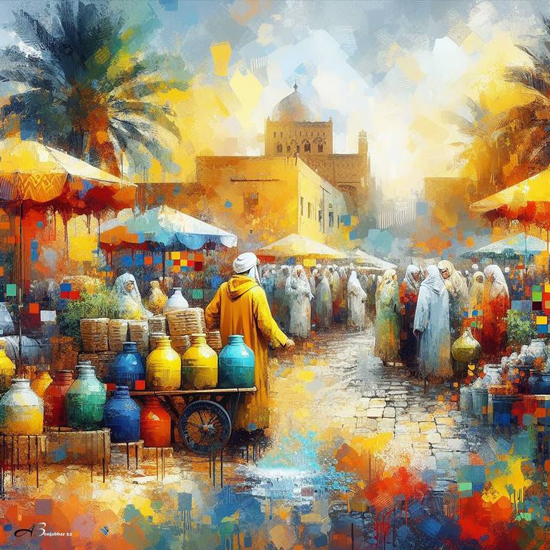 “Colored Pottery Seller in a Crowd of Shoppers” is a painting depicting a bustling market scene under a warm golden sky, with a man in a yellow robe pushing a cart full of colorful pottery. Palm trees, traditional architecture and a crowd of differently-dressed shoppers add life and energy to the sc...